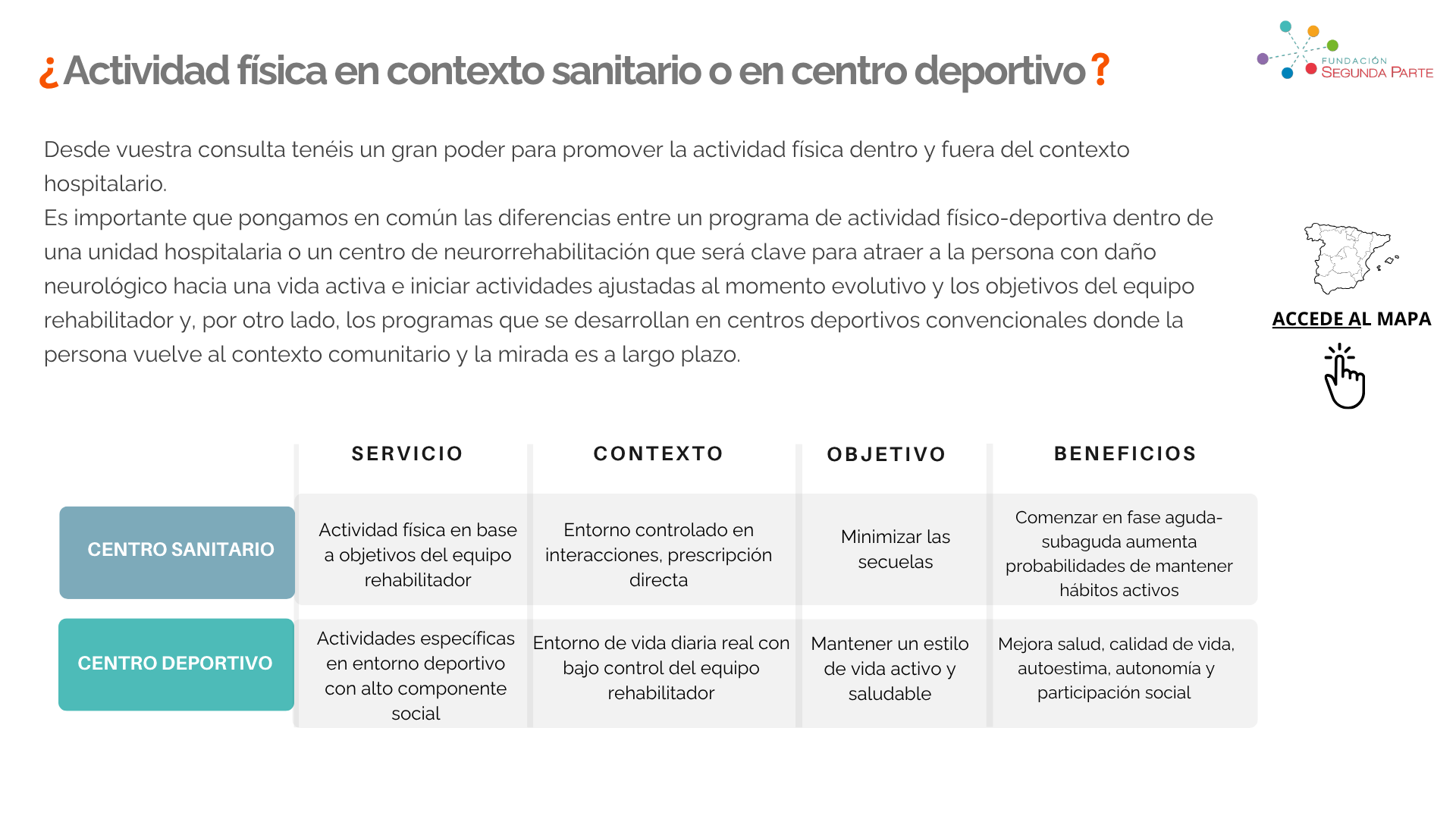 Nuestro objetivo es que la persona con daño neurológico comience la actividad física desde el entorno sanitario para seguir después en el entorno comunitario, en un centro deportivo. Debemos entender qué buscamos en cada contexto!