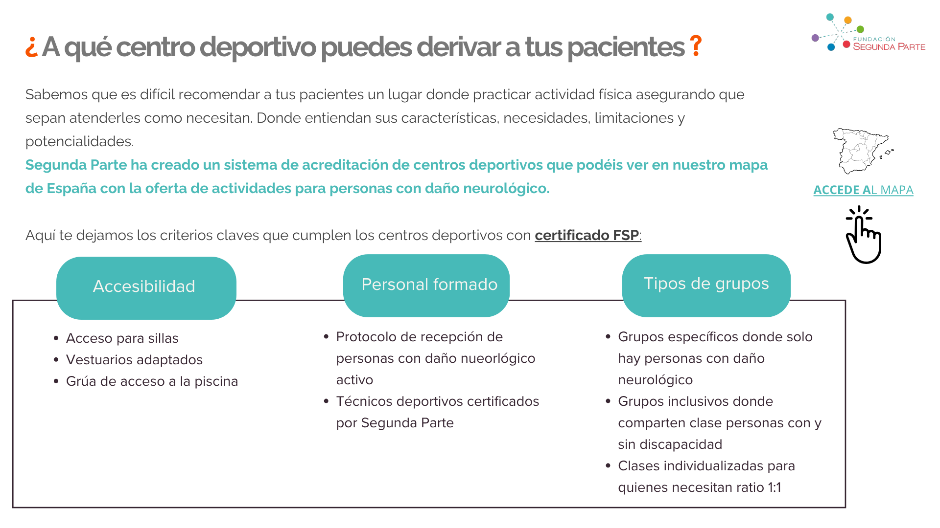 Hemos creado una red de centros acreditados para que puedas recomendar a tus pacientes ir a un centro deportivo donde conocen las pautas claves para atender a personas con daño neurológico ya que han recibido la formación de Segunda Parte.