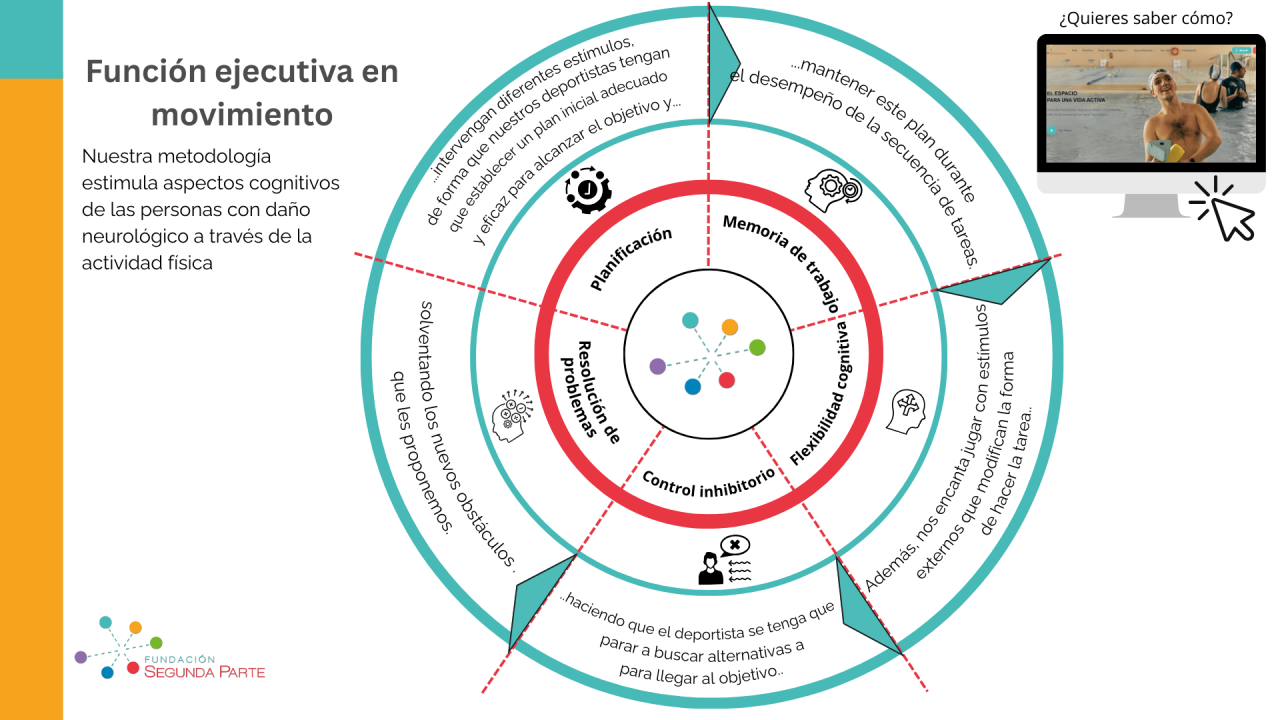 Nuestra metodología estimula la recuperación cognitiva en personas con daño neurológico a través de la actividad física. En esta imagen te mostramos cómo plantear la actividad física para trabajar sobre la planificación, la memoria de trabajo, la flexibilidad cognitiva, el control inhibitorio y la resolución de problemas. Si quieres saber más, ¡atenta a nuestros nuevos cursos!
